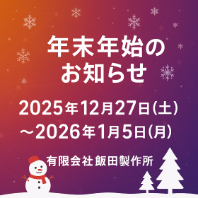 平素より格別のご高配を賜り、誠にありがとうございます。 誠に勝手ながら、下記の期間を年末年始休業とさせていただきます。 <年末年始休業日> 2025年12月27日(土)~2026年1月5日(月) 期間中は業務をお休みさせていただきますが、ご用件のある方は IIDA担当者のメールまたはホームページのお問い合わせフォームをご利用ください。 ご連絡への対応は、2026年1月6日(火)以降、順次行ってまいります。 皆様にはご不便をおかけいたしますが、何卒ご理解の程お願い申し上げます。 〈有限会社 飯田製作所 福島第2工場〉 〒969-1204 福島県 本宮市 糠沢字水上21-2 TEL:0243-64-2320 FAX:0243-64-2571