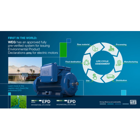 WEGは、EPD Internationalに承認された事前検証システムにのっとった モーターの環境製品宣言(EPD)を発行できる企業となりました。 EPDとは、製品のライフサイクル全体にわたる環境性能を、標準規格で 記載する図書です。これにより、製品の透明性·信頼性·信憑性が高まり、 お客様は検証済みデータに基づいて製品を比較し、より適切な選択を 行うことが可能になります。 この革新的な取り組みは、WEGが掲げる「より効率的で持続可能な世界の ための技術とソリューションを開発する」という使命を体現するものです。 そして、産業界全体が持続可能な社会への道を前進させるための強力な 推進力となっています。